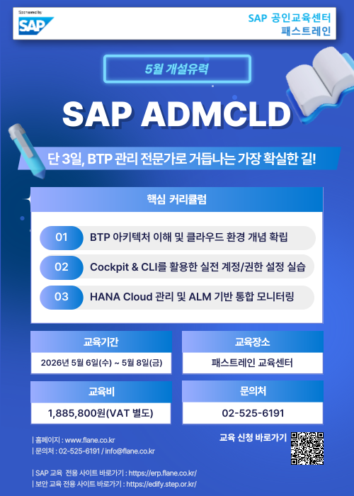 공지사항 - [진행중] [패스트레인-SAP] 5월 SAP BTP ADMCLD 과정 개설유력!
